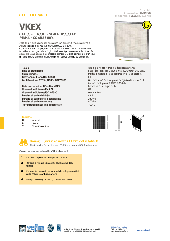 Cella filtrante piana con setto sintetico in classe ISO Coarse 80% (ISO 16890), certificata ATEX secondo la normativa ISO EN 80079-36:2016. Il telaio è formato da acciaio zincato e su entrambi i lati è presente una rete ondulata di acciaio zincato elettrosaldato a contenimento della media sintetica progressiva di poliestere. Ad ogni cella viene aggiunta una treccia di messa a terra composta da un cavo di rame isolato di colore giallo/verde e di due capicorda ad occhiello. Nella fase di assemblaggio viene dedicata particolare attenzione all'inserimento del pacco filtrante in modo da renderlo solidale al telaio per evitare possibili passaggi di polvere.