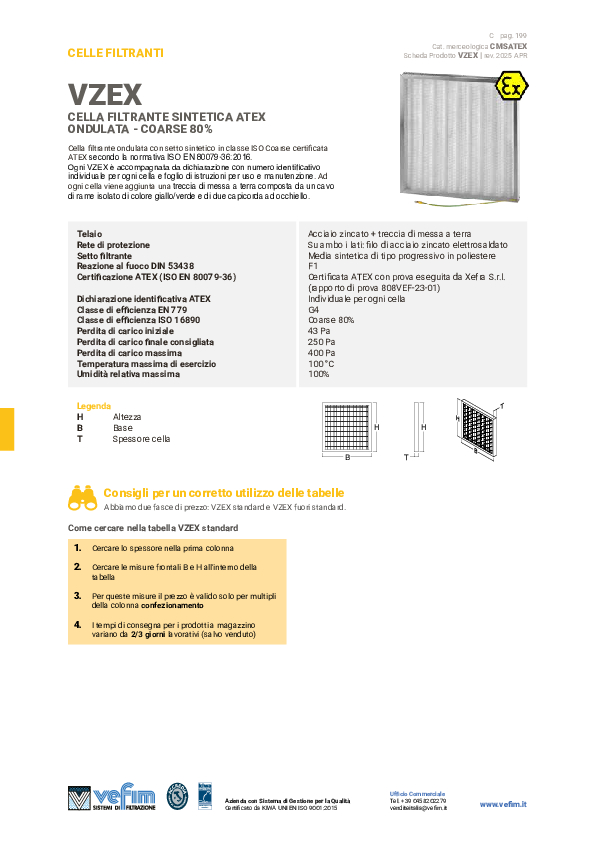 Cella filtrante ondulata con setto sintetico in classe ISO Coarse 80% (ISO 16890), certificata ATEX secondo la normativa ISO EN 80079-36:2016. Il telaio è formato da acciaio zincato e su entrambi i lati è presente una rete ondulata di acciaio zincato elettrosaldato a contenimento della media sintetica progressiva di poliestere. Ad ogni cella viene aggiunta una treccia di messa a terra composta da un cavo di rame isolato di colore giallo/verde e di due capicorda ad occhiello. L'ondulatura, rispetto al modello piano e a parità di dimensioni, aumenta la superficie filtrante allungando la vita utile della cella. Infatti il rapporto tra superficie frontale e superficie filtrante è circa il doppio nei modelli con spessore 48 mm e circa il triplo in quelli con spessore 98 mm. Nella fase di assemblaggio viene dedicata particolare attenzione all'inserimento del pacco filtrante in modo da renderlo solidale al telaio per evitare possibili passaggi di polvere.