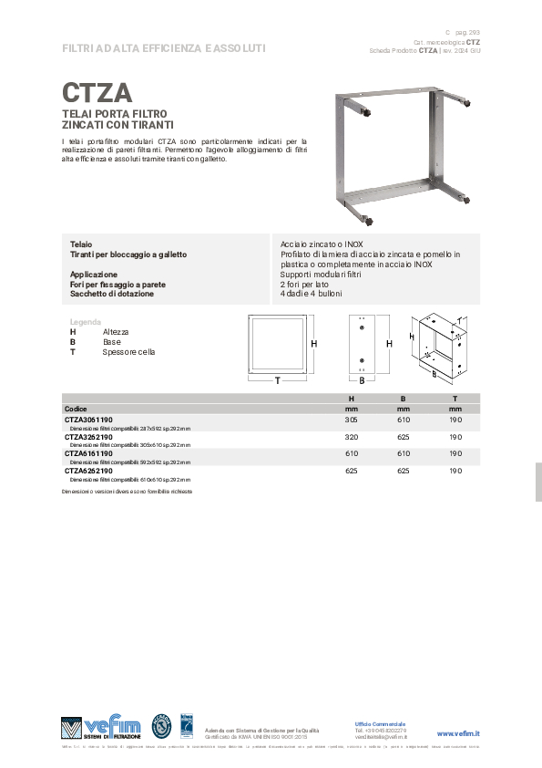 Dimensioni o versioni diverse sono disponibili a richiestaH B T Filtro compatibile Codice mm mm mm spessore 292 CTZA3061190 305 610 190 287x592 CTZA3262190 320 625 190 305x610 CTZA6161190 610 610 190 592x592 CTZA6262190 625 625 190 610x610